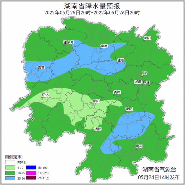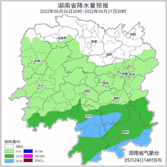 24日20時(shí)至25日20時(shí),岳陽(yáng)陰天間多云,其他地區(qū)陰天有小雨,其中永州南部、郴州南部、株洲南部局地中到大雨;南風(fēng)2~3級(jí);最高氣溫湘南25~27℃,其他地區(qū)27~29℃;最低氣溫19~21℃。