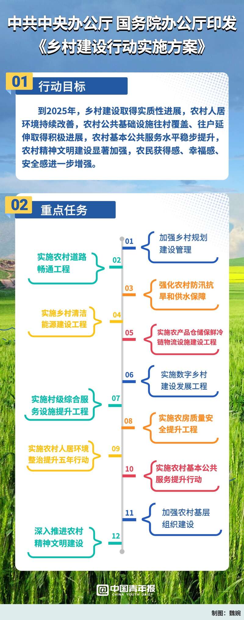 圍繞加強(qiáng)農(nóng)村基礎(chǔ)設(shè)施和公共服務(wù)體系建設(shè),《方案》明確了“加強(qiáng)鄉(xiāng)村規(guī)劃建設(shè)管理”等12項(xiàng)重點(diǎn)任務(wù),并就“創(chuàng)新鄉(xiāng)村建設(shè)推進(jìn)機(jī)制”“強(qiáng)化政策支持和要素保障”“加強(qiáng)組織領(lǐng)導(dǎo)”等作出細(xì)化部署,在道路、供水、能源、物流、信息化、綜合服務(wù)、農(nóng)房、農(nóng)村人居環(huán)境等方面實(shí)施八大工程,加強(qiáng)農(nóng)村重點(diǎn)領(lǐng)域基礎(chǔ)設(shè)施建設(shè)。