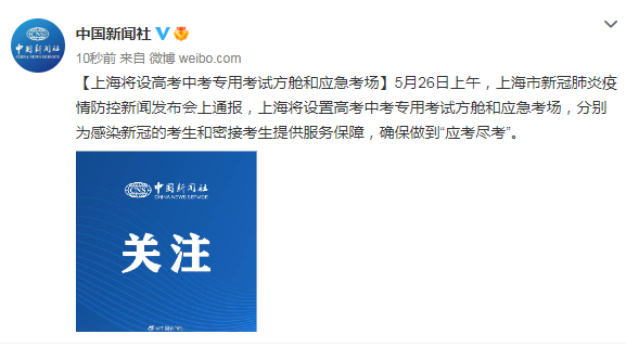 5月26日上午,上海市新冠肺炎疫情防控新聞發(fā)布會上通報(bào),上海將設(shè)置高考中考專用考試方艙和應(yīng)急考場,分別為感染新冠的考生和密接考生提供服務(wù)保障,確保做到“應(yīng)考盡考”。