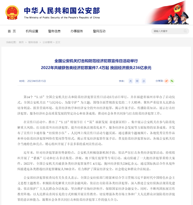公安部:2022年共破獲各類經(jīng)濟犯罪案件7.4萬起