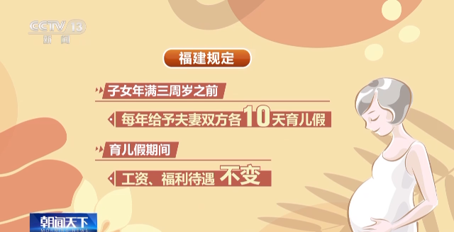 福建規(guī)定,子女年滿3周歲之前,每年給予夫妻雙方各10天育兒假,育兒假期間,工資、福利待遇不變。