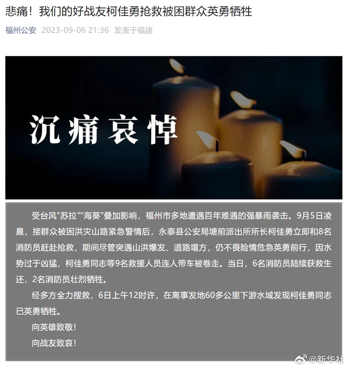 受臺風“蘇拉”“海葵”疊加影響,福州市多地遭遇百年難遇的強暴雨襲擊。9月5日凌晨,接群眾被困洪災山路緊急警情后,永泰縣公安局塘前派出所所長柯佳勇立即和8名消防員趕赴搶救,期間盡管突遇山洪暴發(fā)、道路塌方,仍不畏險情危急英勇前行,因水勢過于兇猛,柯佳勇同志等9名救援人員連人帶車被卷走。當日,6名消防員陸續(xù)獲救生還,2名消防員壯烈犧牲。經多方全力搜救,6日上午12時許,在離事發(fā)地60多公里下游水域發(fā)現(xiàn)柯佳勇同志已英勇犧牲。(記者:王成 來源:福州公安)