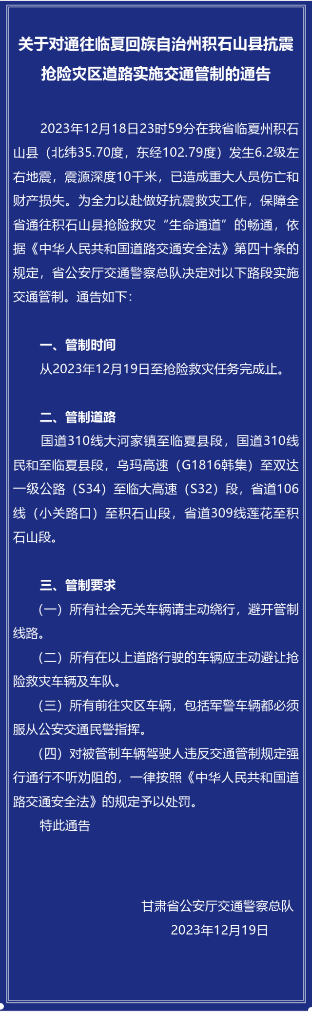 2023年12月18日23時59分在甘肅省臨夏州積石山縣發(fā)生6.2級左右地震,已造成重大人員傷亡和財產(chǎn)損失。為全力以赴做好抗震救災工作,保障甘肅全省通往積石山縣搶險救災“生命通道”的暢通,甘肅省公安廳交通警察總隊對抗震搶險災區(qū)道路實施交通管制,至搶險救災任務完成止,詳情如下: