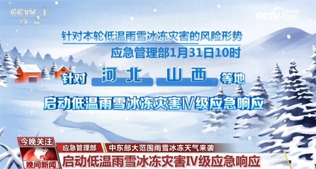 針對本輪低溫雨雪冰凍災害的風險形勢,應急管理部1月31日10時,針對河北、山西等地啟動低溫雨雪冰凍災害Ⅳ級應急響應。同時,國家防災減災救災委員會辦公室、應急管理部等部門派出2個工作組分赴河南和湖北,協助指導低溫雨雪冰凍災害防范應對工作。中國氣象局1月31日上午啟動重大氣象災害(雨雪冰凍)Ⅲ級應急響應。