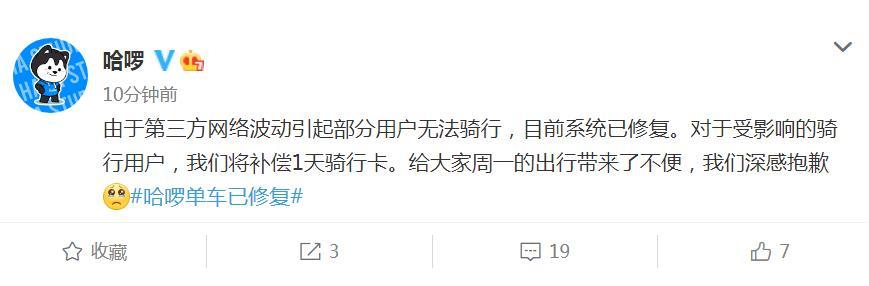 哈啰回應(yīng)單車崩了:系統(tǒng)已修復 補償1天騎行卡