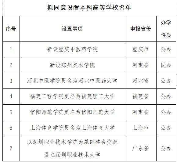 教育部公示7所擬同意設(shè)置本科高等學(xué)校名單