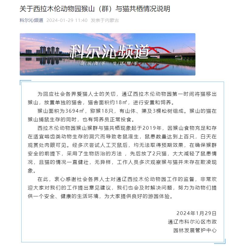 中新網(wǎng)1月29日電 據(jù)內(nèi)蒙古通遼市科爾沁區(qū)融媒體中心微信公眾號消息,通遼市科爾沁區(qū)市政園林發(fā)展管護中心29日發(fā)布《關(guān)于西拉木倫動物園猴山(群)與貓共棲情況說明》(下稱“情況說明”)。情況說明顯示,通遼西拉木倫動物園已第一時間將貓移出猴山,且貓的情況一直健壯,無異樣,工作人員多次觀察猴與貓并未存在欺凌現(xiàn)象。全文如下: