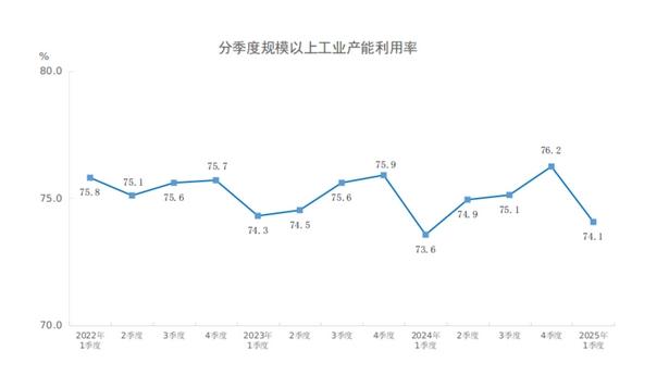 分三大門(mén)類(lèi)看,2025年一季度,采礦業(yè)產(chǎn)能利用率為74.6%,比上年同期下降0.4個(gè)百分點(diǎn);制造業(yè)產(chǎn)能利用率為74.1%,上升0.3個(gè)百分點(diǎn);電力、熱力、燃?xì)饧八a(chǎn)和供應(yīng)業(yè)產(chǎn)能利用率為73.6%,上升2.4個(gè)百分點(diǎn)。