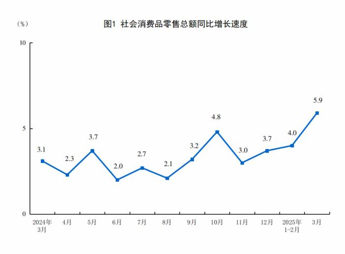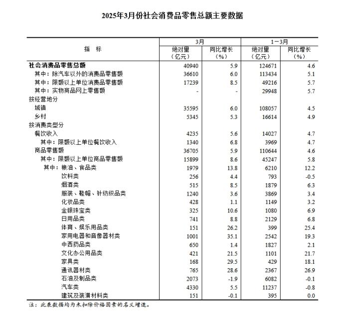 按消費(fèi)類型分,3月份,商品零售額36705億元,同比增長5.9%;餐飲收入4235億元,增長5.6%。1—3月份,商品零售額110644億元,增長4.6%;餐飲收入14027億元,增長4.7%。
