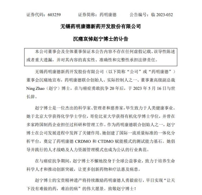 藥明康德發(fā)布的訃告稱,趙寧在與癌癥勇敢抗?fàn)?0年后,于2023年5月16日與世長辭。