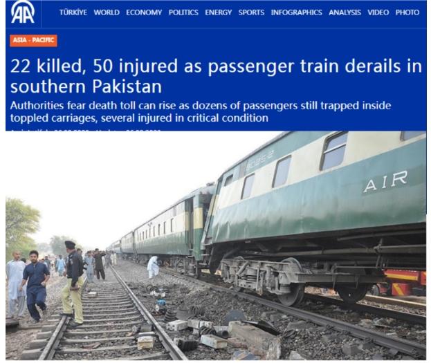 據(jù)報道,一名巴基斯坦南部信德省官員稱,當(dāng)天,從卡拉奇開往哈維連的一列客運火車在信德省??藸柕貐^(qū)附近脫軌,有至少10節(jié)車廂沖出軌道。