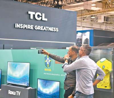 在2023年圣保羅國際消費類電子及家用電器產(chǎn)品展覽會上,參觀者在TCL展臺前合影留念。