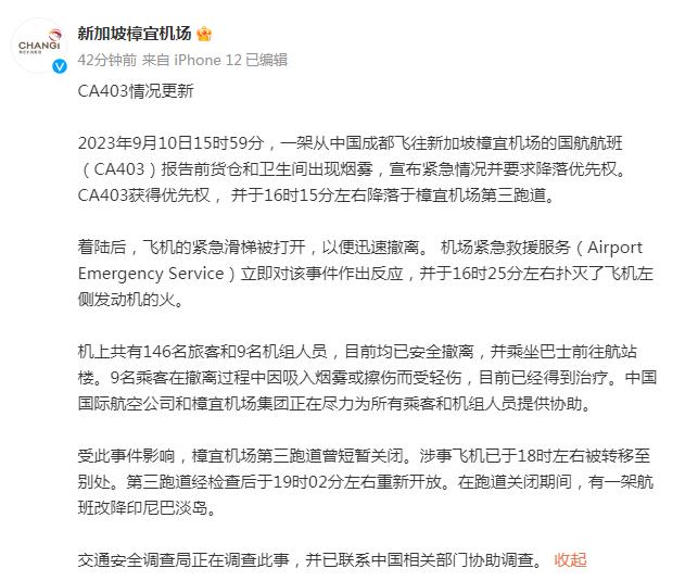 機(jī)上共有146名旅客和9名機(jī)組人員,目前均已安全撤離,并乘坐巴士前往航站樓。9名乘客在撤離過程中因吸入煙霧或擦傷而受輕傷,目前已經(jīng)得到治療。中國國際航空公司和樟宜機(jī)場集團(tuán)正在盡力為所有乘客和機(jī)組人員提供協(xié)助。