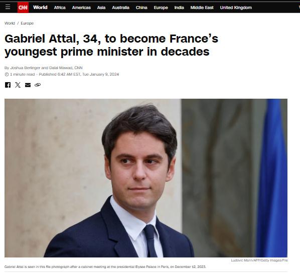 據(jù)報(bào)道,現(xiàn)任法國(guó)國(guó)民教育和青年部長(zhǎng)阿塔爾,將成為自1958年法蘭西第五共和國(guó)成立以來(lái)該國(guó)最年輕的總理。
