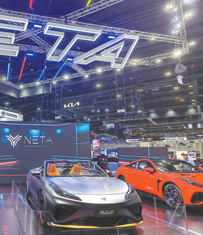 在2023年舉辦的第四十屆泰國國際汽車博覽會上,中國品牌新能源汽車廣受關(guān)注。圖為哪吒汽車展區(qū)。