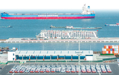 新年伊始,上海外高橋海通國際汽車碼頭一派繁忙景象,“上汽安吉申誠”號汽車滾裝船首航前往歐洲,船上一共搭載近5000輛中國自主品牌新車,其中約一半是新能源汽車;