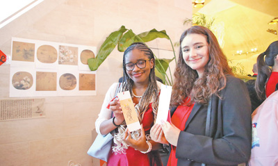 圖為在文化體驗展臺,兩名美國學生展示自己用毛筆繪制的書簽。