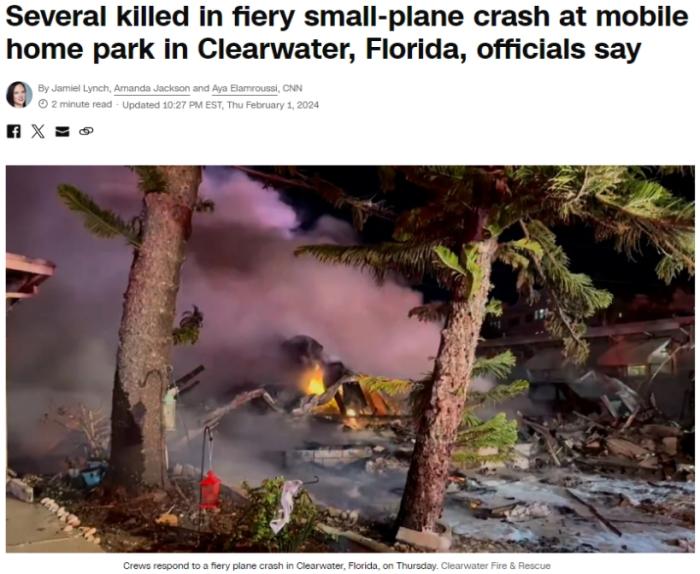 中新網(wǎng)2月2日電 據(jù)美國有線電視新聞網(wǎng)(CNN)報(bào)道,當(dāng)?shù)貢r(shí)間2月1日晚,一架小型飛機(jī)在美國佛羅里達(dá)州克利爾沃特市的一處公園墜毀。