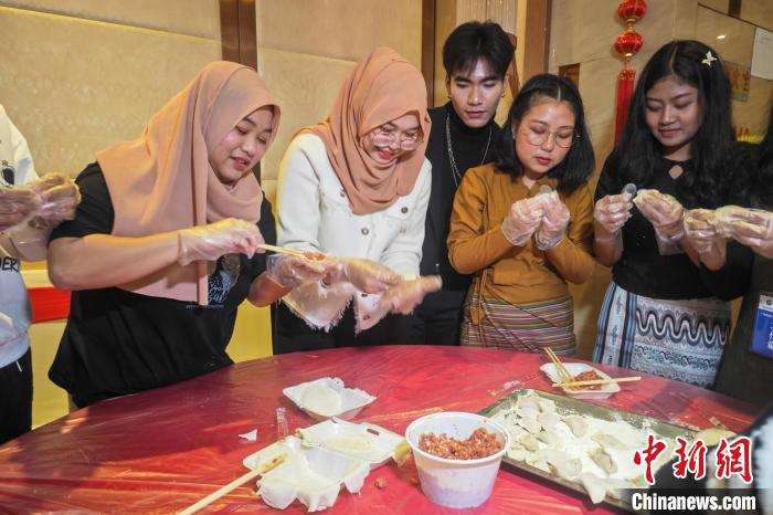 2月3日,廣西民族大學(xué)舉辦留學(xué)生春節(jié)團(tuán)拜會活動。圖為留學(xué)生在包餃子。陳冠言 攝
