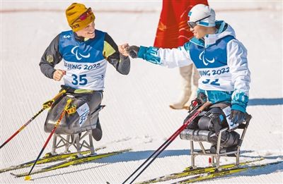 3月8日,在北京冬殘奧會(huì)殘奧冬季兩項(xiàng)男子中距離坐姿組比賽后,中國代表團(tuán)運(yùn)動(dòng)員劉夢濤(右)與德國代表團(tuán)運(yùn)動(dòng)員馬丁·弗萊格相互致意、共同慶祝。