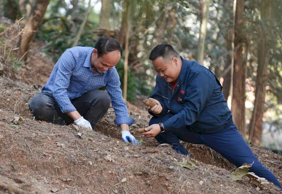 俞???右一)正在指導農(nóng)戶種植天麻。龔旭東供圖