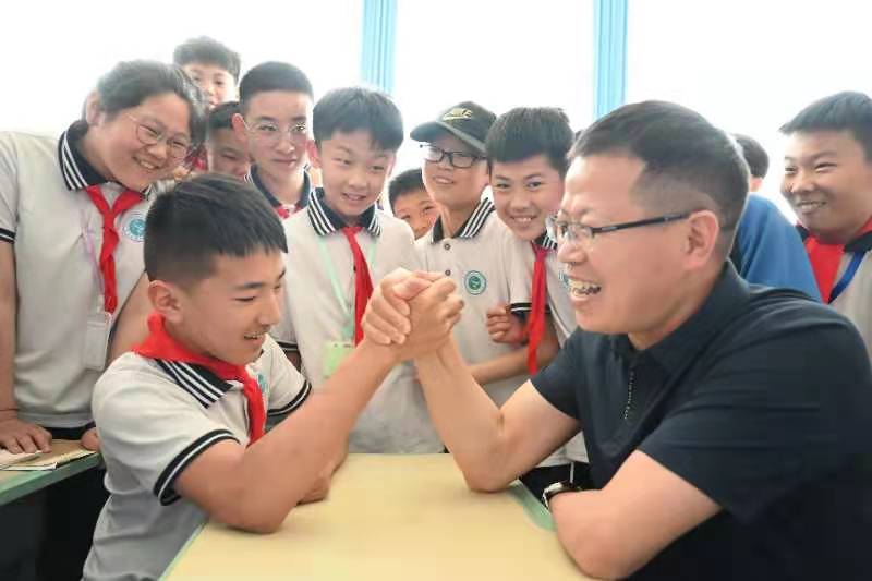 人民網(wǎng)莒縣5月26日電 5月26日上午,山東莒縣博雅實驗學(xué)校校長張迪洲(右)在課間同學(xué)生們一起玩掰手腕游戲,孩子們笑的很開心。