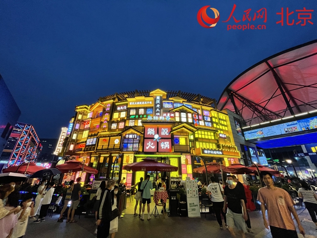 雖是工作日傍晚,剛過6點,華熙LIVE·五棵松的街區(qū)上人已熙熙攘攘,要想嘗嘗網紅餐廳,已經需要拿號等位了。順著香味一路走,一家裝潢極具重慶吊腳樓特色的火鍋店十分引人注目,成了夜景打卡地,飄香的麻辣味也勾起了不少食客的“饞蟲”。
