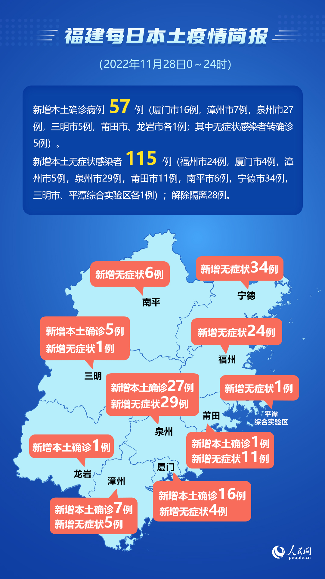 人民網(wǎng)福州11月29日電 (江葦杭、陳永整)據(jù)福建省衛(wèi)健委網(wǎng)站消息,11月28日0-24時(shí),福建省報(bào)告新增本土確診病例新增本土確診病例57例(廈門(mén)市16例,漳州市7例,泉州市27例,三明市5例,莆田市、龍巖市各1例;其中無(wú)癥狀感染者轉(zhuǎn)確診5例)。當(dāng)日?qǐng)?bào)告新增本土無(wú)癥狀感染者115例(福州市24例,廈門(mén)市4例,漳州市5例,泉州市29例,莆田市11例,南平市6例,寧德市34例,三明市、平潭綜合實(shí)驗(yàn)區(qū)各1例);解除隔離28例。全省本土確診病例目前住院365例,無(wú)死亡病例;現(xiàn)有本土無(wú)癥狀感染者尚在接受集中隔離醫(yī)學(xué)觀察623例。