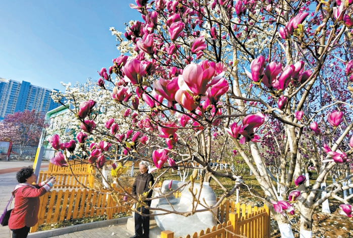 5日,許多市民來(lái)到北京國(guó)際雕塑公園踏青賞花,在盛開(kāi)的玉蘭花前拍照留念。本報(bào)記者 吳鏑攝