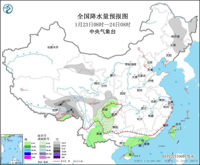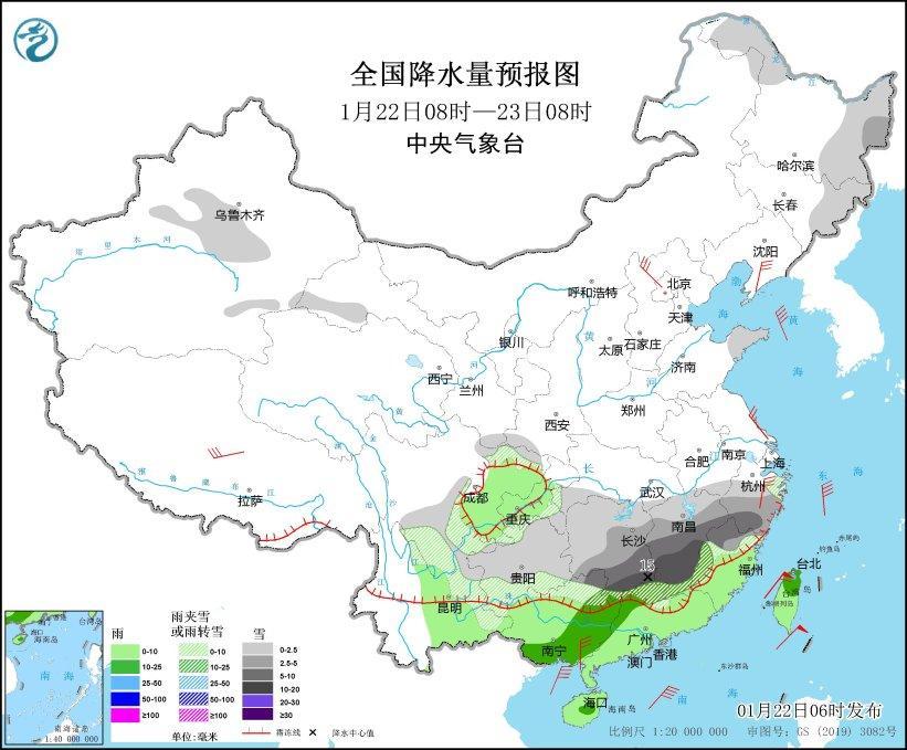 1月22日08時至23日08時,黑龍江東部和西北部、吉林東部、新疆中部、甘肅河西、川西高原西南部、四川盆地南部、陜西南部、重慶東部、云南東部、貴州、湖北西部、湖南南部、江西、安徽南部、浙江中南部、福建北部、廣東北部、廣西北部等地部分地區(qū)有小到中雪或雨夾雪,其中,湖南南部、江西中南部、浙江西南部、福建西北部、廣西東北部、廣東北部等地部分地區(qū)有大到暴雪(10~15毫米)。四川盆地中部、云南中部、廣西中南部、廣東中南部、福建中南部、海南島、臺灣島等地部分地區(qū)有小到中雨。遼東半島、河北北部、浙江北部、廣西東南部沿海等地部分地區(qū)有5~6級風(fēng),渤海、渤海海峽、黃海、東海、臺灣海峽、臺灣以東洋面、巴士海峽、南海大部、北部灣等海域有6~8級風(fēng),陣風(fēng)9~10級(見圖3)。