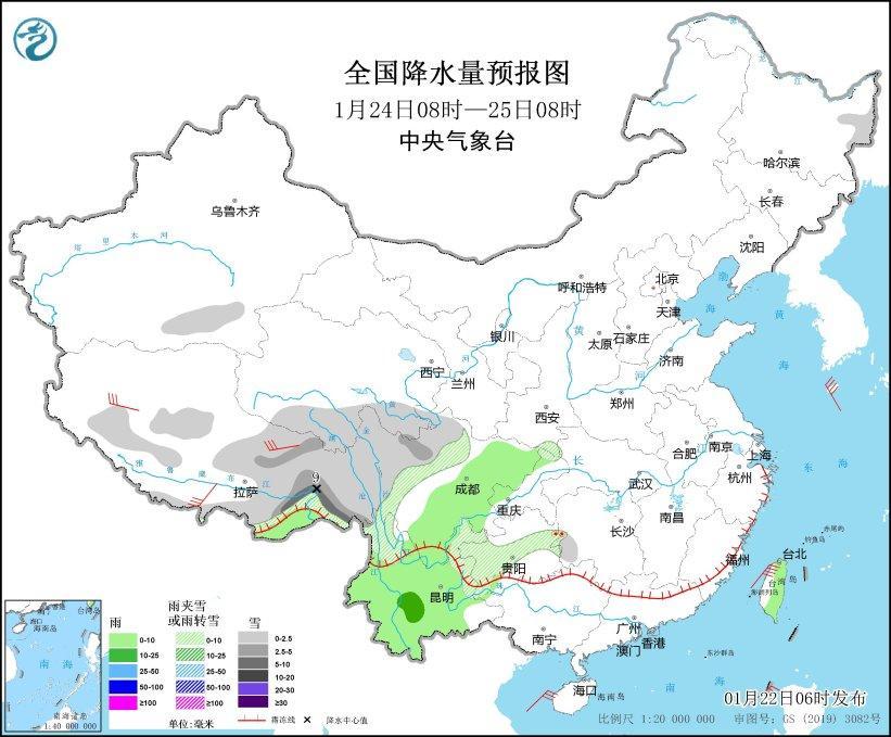 圖5 全國降水量預(yù)報圖(1月24日08時-25日08時)