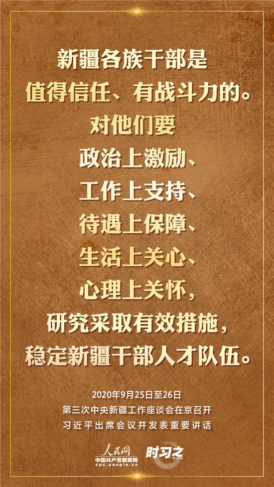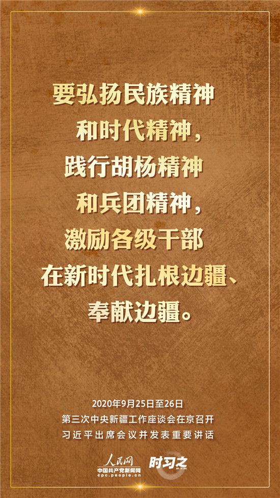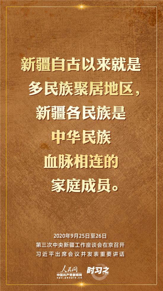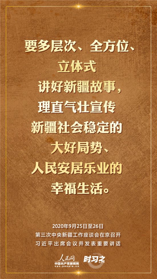 9月25日至26日,第三次中央新疆工作座談會在北京召開。習近平總書記出席會議并發(fā)表重要講話。習近平全面總結了第二次中央新疆工作座談會以來新疆工作取得的重大成效,深入分析了當前新疆工作面臨的形勢,闡釋了新時代黨的治疆方略,明確了當前和今后一個時期新疆工作的指導思想、目標任務、方針政策、戰(zhàn)略舉措,全面部署了推動新疆社會穩(wěn)定和長治久安的重點工作。人民網·中國共產黨新聞網“時習之”欄目帶您聆聽總書記那些直抵人心的講話金句。