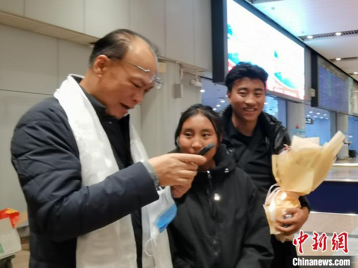 11月14日下午,來自西藏自治區(qū)昌都市的8名脊柱側(cè)彎患者到達北京首都國際機場。圖為北京大學第一醫(yī)院骨科主任李淳德(左)和藏族女孩澤巴央宗、哥哥貢布鄧珠交談?!⌒煅┈?攝