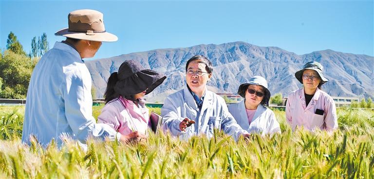 8月16日,山東援藏農(nóng)業(yè)專家、日喀則市農(nóng)牧業(yè)科學(xué)研究推廣中心副主任張斌(中)在青稞試驗(yàn)田里指導(dǎo)種植。經(jīng)濟(jì)日報(bào)記者 袁勇 攝