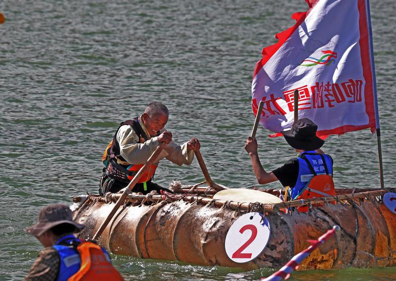 6月9日,2024年西藏自治區(qū)端午節(jié)牛皮船(龍舟)賽在拉薩市金珠東路濱河公園水域舉行。圖為正在進(jìn)行賽龍舟比賽。記者 白瑪澤旺 攝
