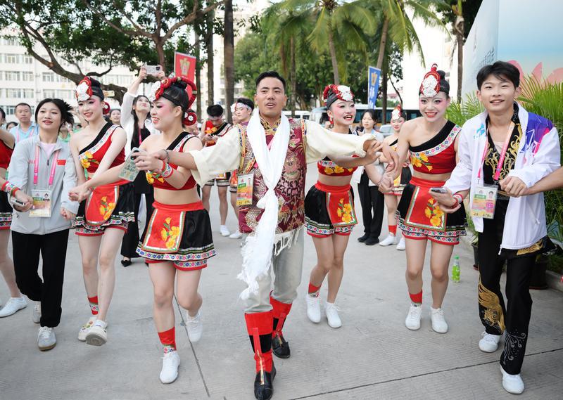 11月22日,由國家民委和國家體育總局主辦、海南省人民政府承辦的第十二屆全國少數(shù)民族傳統(tǒng)體育運動會在海南三亞開幕。圖為第十二屆全國少數(shù)民族傳統(tǒng)體育運動會西藏代表團民族健身操運動員賽后與福建代表團運動員一起跳鍋莊。