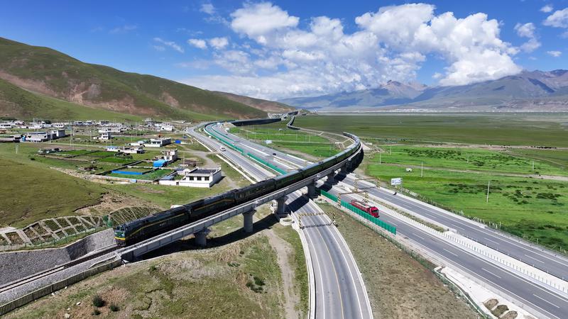 6月30日,G4218雅安至葉城國家高速公路拉薩至日喀則機場段項目建成通車。圖為318國道 、拉日鐵路 、拉日高等級公路 交錯并行。記者 索朗群培 次旦央吉 扎西頓珠
