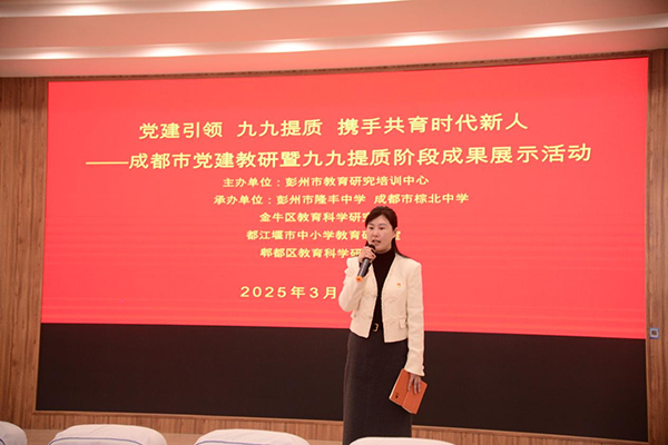 陽春三月,齊聚彭州共教研。為全面貫徹落實(shí)黨的二十屆三中全會(huì)和全國教育大會(huì)精神,系統(tǒng)推進(jìn)黨的教育方針和黨中央決策部署在中小學(xué)得到貫徹落實(shí),堅(jiān)持“為黨育人、為國育才”。3月25日下午,彭州市隆豐中學(xué)開展成都市黨建教研暨“九九提質(zhì)”階段成果展示活動(dòng)。
