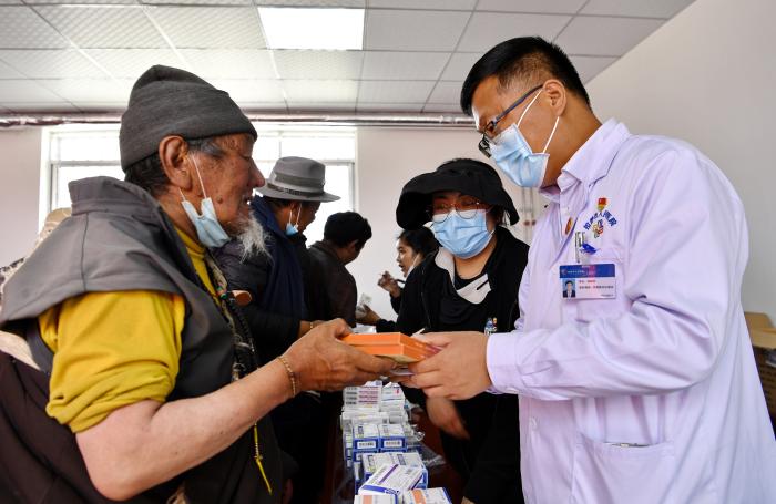 圖為2022年6月9日,時(shí)任拉薩市人民醫(yī)院院長(zhǎng)、北京市第七批醫(yī)療人才“組團(tuán)式”援藏醫(yī)療隊(duì)隊(duì)長(zhǎng)孫樹(shù)學(xué)(前排右)在拉薩市當(dāng)雄縣格達(dá)鄉(xiāng)為群眾義診發(fā)藥 受訪者供圖