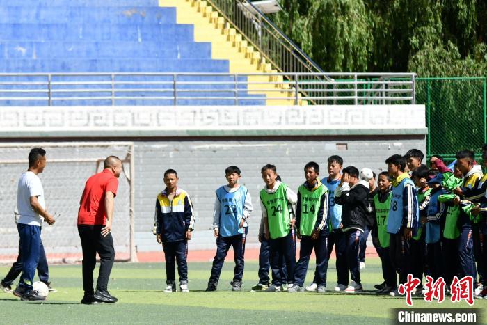 圖為在昌都市察雅縣中學,重慶市第二十九中學校教師黃華(左二)向?qū)W生們教授足球技巧。昭信教育研究院 供圖