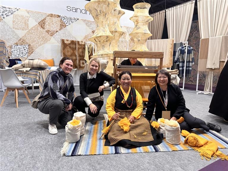 上海市援藏干部人才引進(jìn)的沙涓攜西藏江孜氆氌亮相2024年法國巴黎Maison&Objet展會(huì)。
