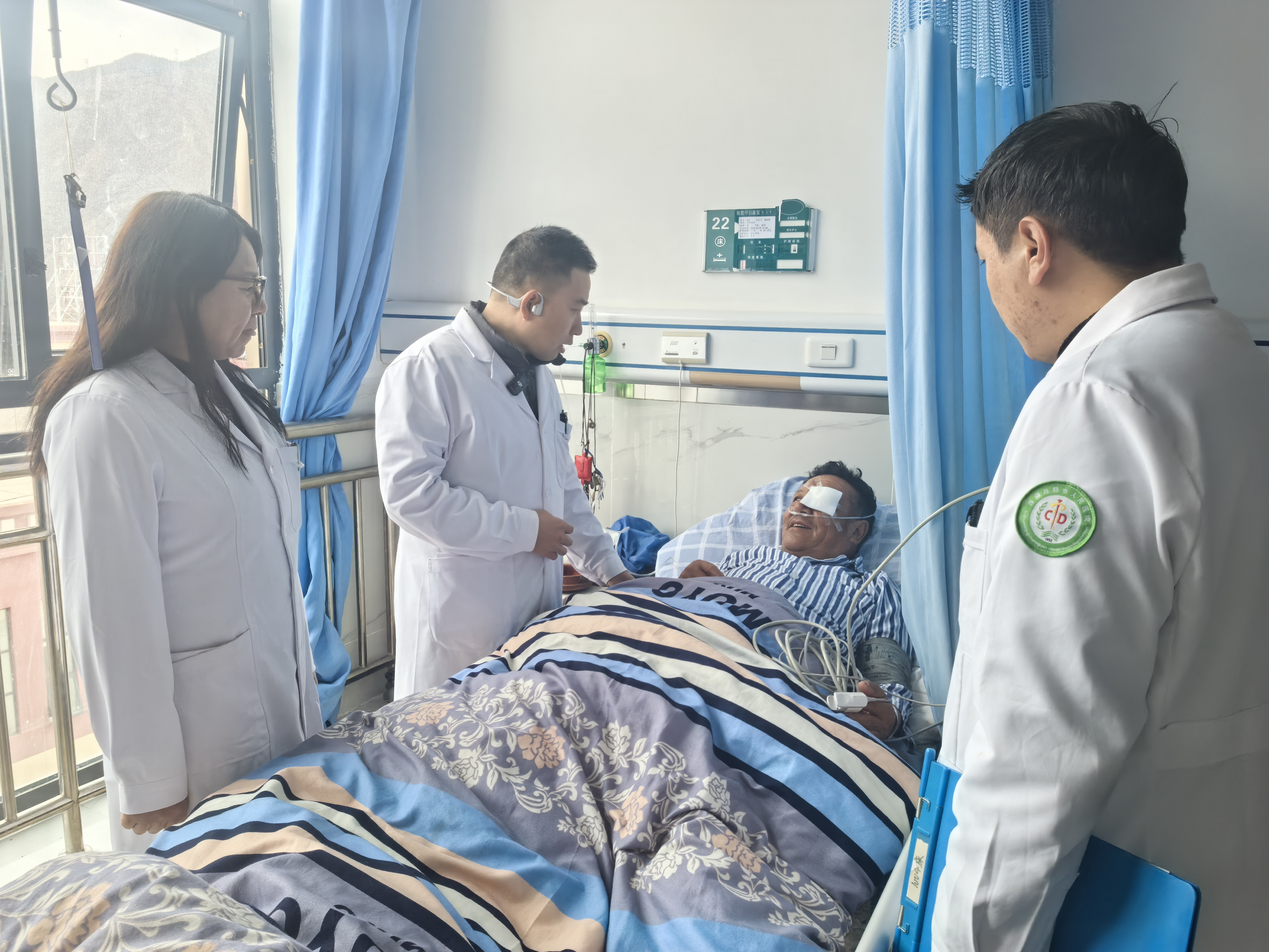 重慶對(duì)口支援昌都市人民醫(yī)院副院長(zhǎng)胡柯(左二)查看患者術(shù)后恢復(fù)情況。昌都市融媒體中心記者 何瑞 仁青攝