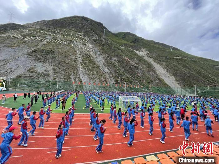 圖為德欽縣第一小學(xué)的學(xué)生們?cè)谏险n間操?!】姵?攝