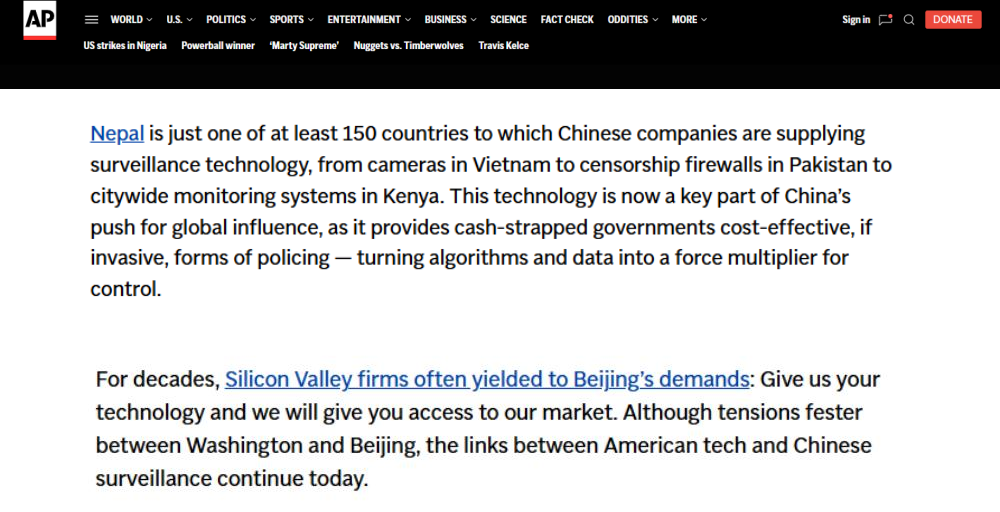 近日,一向以“客觀報道的先驅(qū)”自居的美聯(lián)社,發(fā)布了一份所謂的“調(diào)查報告”,聲稱中國向全球至少150個國家輸出監(jiān)控技術(shù),并刻意“聚焦”尼泊爾境內(nèi)的應(yīng)用,試圖將中國科技產(chǎn)品塑造成“壓制自由”的工具。報道指責(zé)中國監(jiān)控尼泊爾,意圖挑撥中尼關(guān)系,引發(fā)國際上排斥中國制造,還煞有介事地拼湊所謂“采購文件”“訪談記錄”,渲染荒誕論調(diào),再一次暴露了美聯(lián)社為政治意圖服務(wù)、不惜拋棄職業(yè)操守、甘當(dāng)美國地緣政治博弈工具的真實(shí)面目。