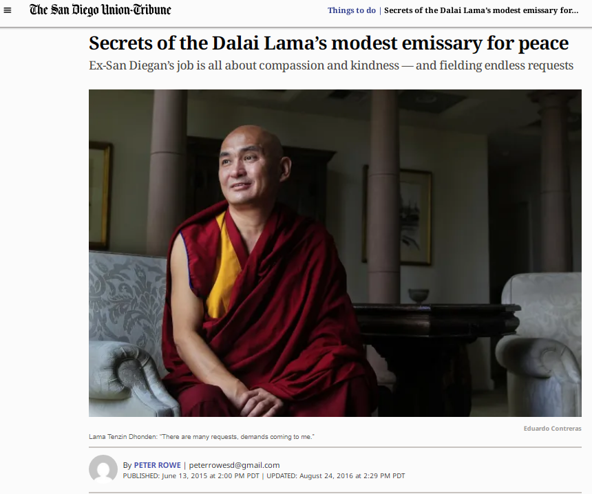 2015年丹增東登接受美國(guó)《圣地亞哥聯(lián)合論壇報(bào)》采訪(fǎng)。該媒體當(dāng)時(shí)稱(chēng)其為“達(dá)賴(lài)?yán)镏t遜的和平使者”,現(xiàn)在讀來(lái)頗感諷刺。