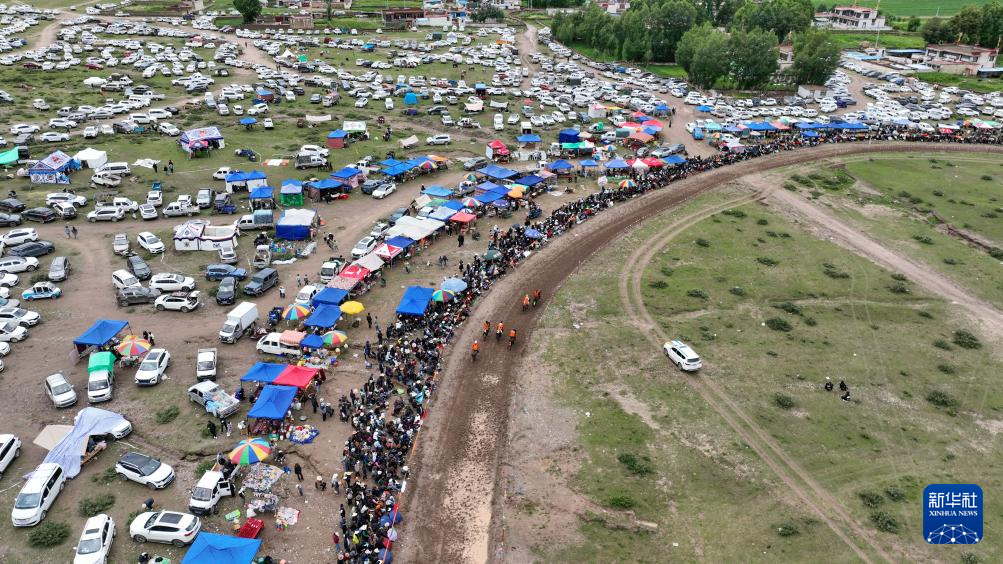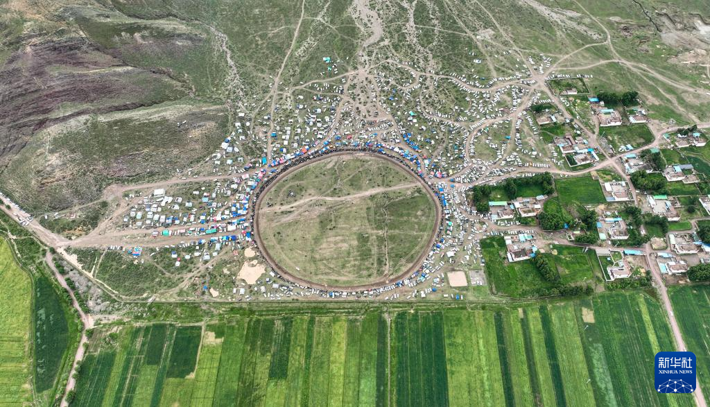 7月23日拍攝的拉薩甘丹曲果鎮(zhèn)賽馬場上的走馬比賽(無人機(jī)照片)。 新華社記者 晉美多吉 攝