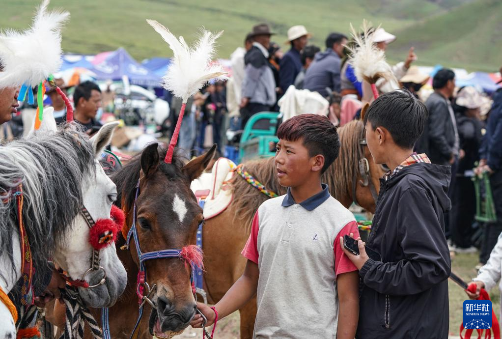 7月23日,一名小騎手欣賞對(duì)手的賽馬。新華社記者 晉美多吉 攝