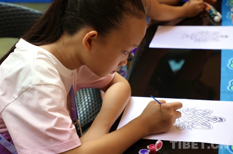 圖為一位小女孩全神貫注地繪畫(huà)唐卡 攝影:龍真多吉