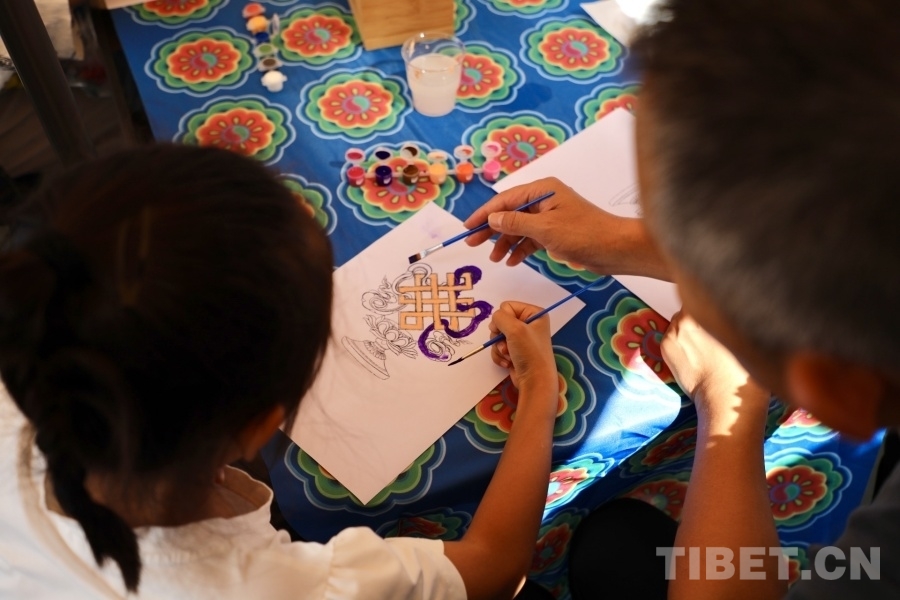 圖為觀眾父女倆在現(xiàn)場(chǎng)體驗(yàn)唐卡繪畫(huà) 攝影:龍真多吉