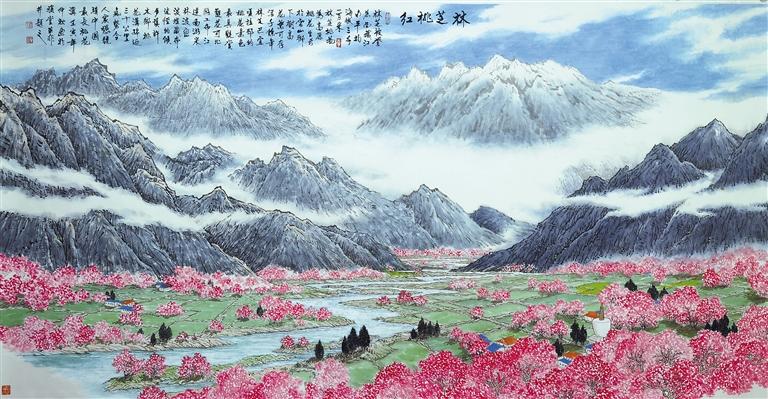 我擺手提示她,悄聲說,不要在這里冒充內(nèi)行,那邊有人。此時那位先生或許聽到了這句話,微笑著挪步過來。他說,林芝這個地方,他去過多次。他要把人們向往的林芝、游客看到的林芝、當?shù)厝耸熘牧种ィ弥袊嫷男问奖憩F(xiàn)出來。這幅畫是以現(xiàn)實主義表達方式創(chuàng)作的,屬中國畫中的寫意山水。這幅畫的素材來自林芝展現(xiàn)給我們的實景元素。繪畫藝術是在發(fā)現(xiàn)美的基礎上創(chuàng)造美。這位女士說得好。你們看,大家熟悉的林芝自然元素,在這幅畫里都能找到,而且桃花是主角,有田野做底色、蒼松積雪相映襯,還有猶如白色哈達的那些云,林芝桃紅讓人印象深刻。我笑言,老哥的這番話,就像這幅畫是你畫的一樣。他說,正因為我們?nèi)ミ^這些地方,觀的是景,繪的是畫,表的是心,所以如同再次身臨其境,沉浸在大自然中。